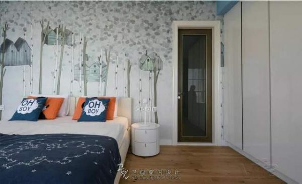 房间在颜色搭配上遵循一种恰到好处的平衡感,淡雅的白色搭配明亮的橙色,在视觉上既不会太热烈也不会太平静。充满童话色彩的树屋背景和奇妙的星座图案的床品极具童趣,设计师巧妙地运用雅致白的衣柜,让空间敞亮起来。且与背景的底色相呼应,整体感觉浑然一体。