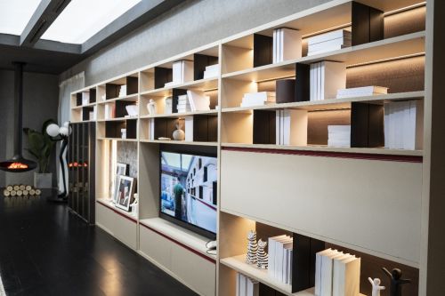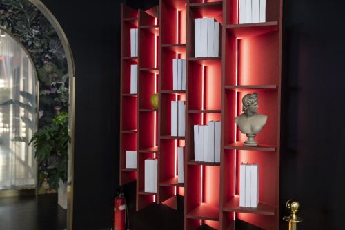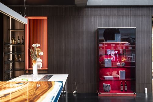 柜内红色染色木皮,在灯光的映衬下,如同被红色浸染一样,热烈喷涌而出,诠释了空间的无限生命力。