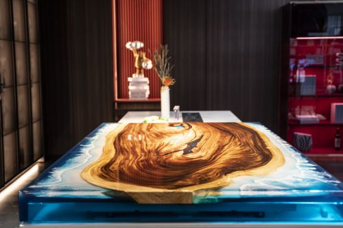 厨房岛台之上,是由树脂和木材结合的具有海岸风情的岛面,不同材料的融合,带来一种无与伦比的视觉效果。