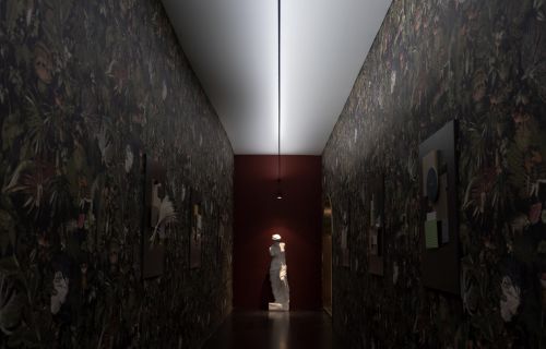 红墙前的断臂维纳斯雕像,是丽博品牌艺术符号的表现,也是高定理念的诠释。