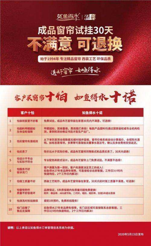 “一心一意做软装,全心全意做服务”,同样是如鱼得水多年来的坚持,窗帘软装是一个消费满意度偏低的行业,作为头部企业,如鱼得水不断探寻提升客户满意度的路径。2020年重磅推出“成品窗帘试挂,30天内不满意可退换”和“客户买窗帘十怕,如鱼得水十诺”两大真诚机制,这是深爱顾客的庄严承诺,也是实际行动。