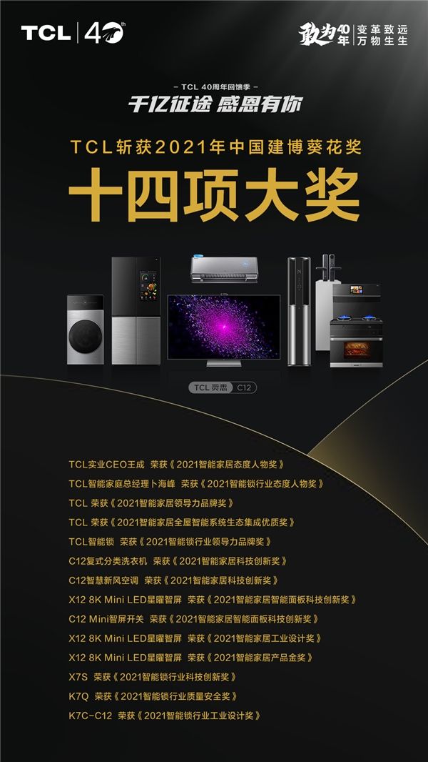 凭借着众多优异智能家居产品,TCL在2021广州建博会举办的“葵花奖”智能家居评选颁奖盛典中,成功斩获14项大奖,再创历史新高。而前文提到的TCL X12 8K Mini LED星曜智屏,更是夺得葵花奖最高荣誉——2021智能家居产品金奖!