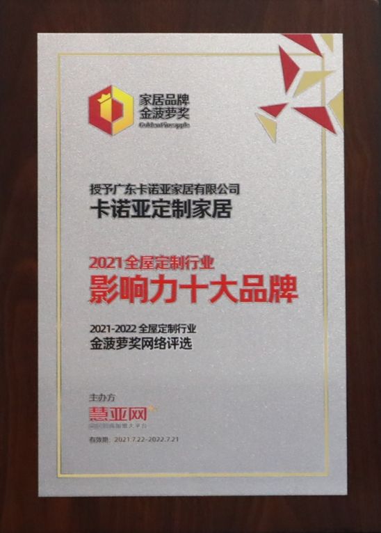2021年7月22日,中国建博会×慧亚网联合主办的第六届中国大定制家居营销发展论坛暨中国家居品牌金菠萝奖颁奖盛典,在广州举行。历经半年来自经销商与用户网络票选结果的公布,卡诺亚定制家居凭借强大的品牌影响力、优质的产品与星级的服务,最终脱颖而出,荣膺“2021全屋定制行业影响力十大品牌”美誉。