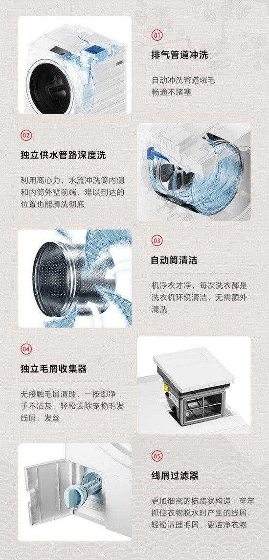 它所打造的五维防毛屑系统能够针对性的提供多种手段去毛屑。首先能够自动冲洗排气管道绒毛,使其在清洗时畅通不堵塞,其次利用离心力,提供独立供水管路深度清洗,全面覆盖无死角,再者加入的自动筒清洁能够保持每次洗衣都拥有洁净的环境,最后加入的独立毛屑收集器和线屑过滤器能够轻松去除宠物毛发等毛屑,让衣物更加洁净。通过内外全方位的深层清洁能够实现衣上筒内无屑清洁,完全不用担心平时和萌宠的亲密互动时衣物上沾染的毛发。