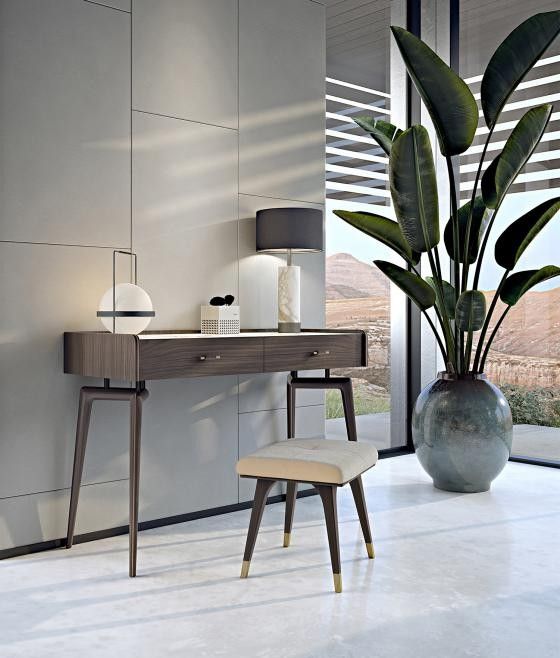 造型方正的床头柜写满了优雅的铜色金属细节;复古感十足的梳妆台最引人注目的是纤细有力的底座;斗柜同样在线条设计上给予了我们独特的感受。