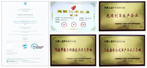 通过全体员工的共同努力,公司不仅在客户中赢得良好口碑,还获得多项品牌荣誉。例如再次荣获国家高新技术企业证书,BPU无溶剂革产品通过全球回收标准(GRS)认证、荣膺“无溶剂革生产企业”,同时荣膺“低碳节能与环保技术领先企业”和“卫生安全合成革产品试点企业”三项荣誉称号等等,这一系列荣誉是国家对高明尚昂研发和技术创新能力的充分肯定,同时标志着该公司在皮革的回收利用方面取得了突破性成就,减轻了企业对不可再生资源的依赖,为企业发展增添绿色动力。