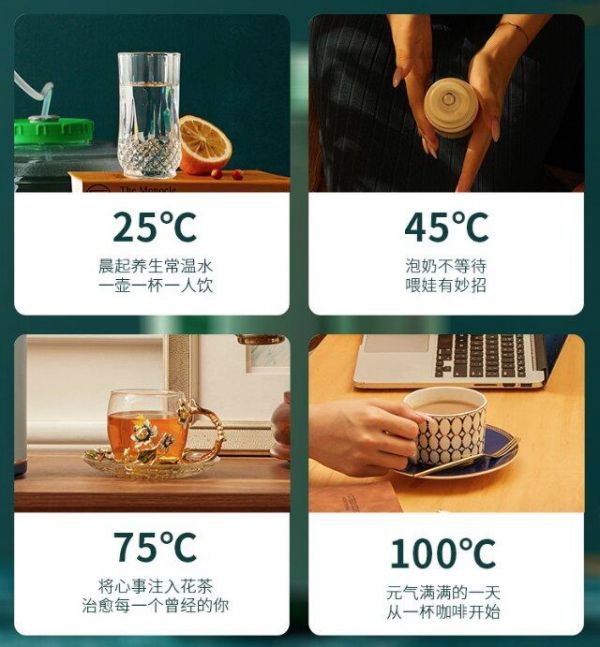 最喜欢的就是它的4档控温功能了:25°C常温水可直饮解渴,45°C水温能泡杯柠檬茶和给孩子冲奶,75°C水温可以冲杯花茶提神养颜,100°C水温冲杯咖啡开启元气满满的一天。