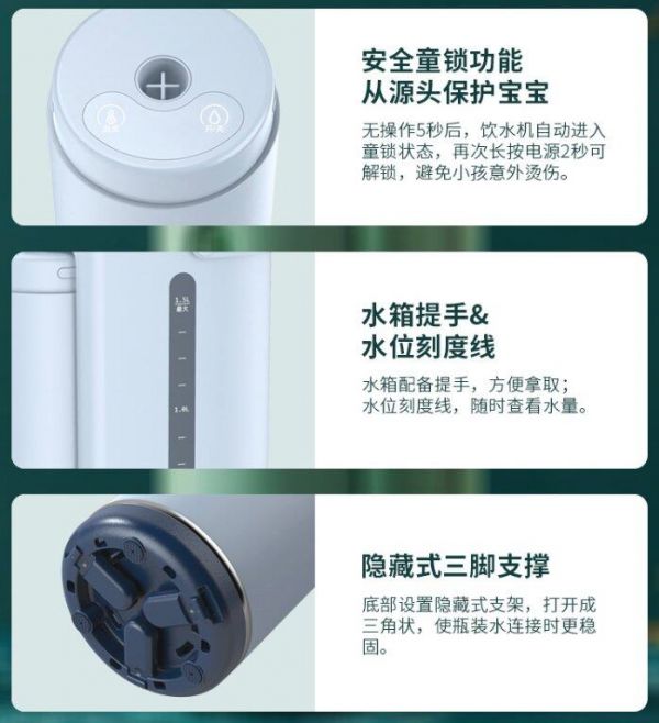 这款即热饮水机在细节方面做的也很好:5秒无操作会自动进入童锁状态,需解锁才能继续使用,防止家中小孩意外烫伤,大人更放心;水箱配备提手,接水拿取感觉很省力,水位刻度线可随时查看水量,也不用怕接多了;底部有隐藏式三脚支架,连接瓶装水时打开,可以让机身更稳固。