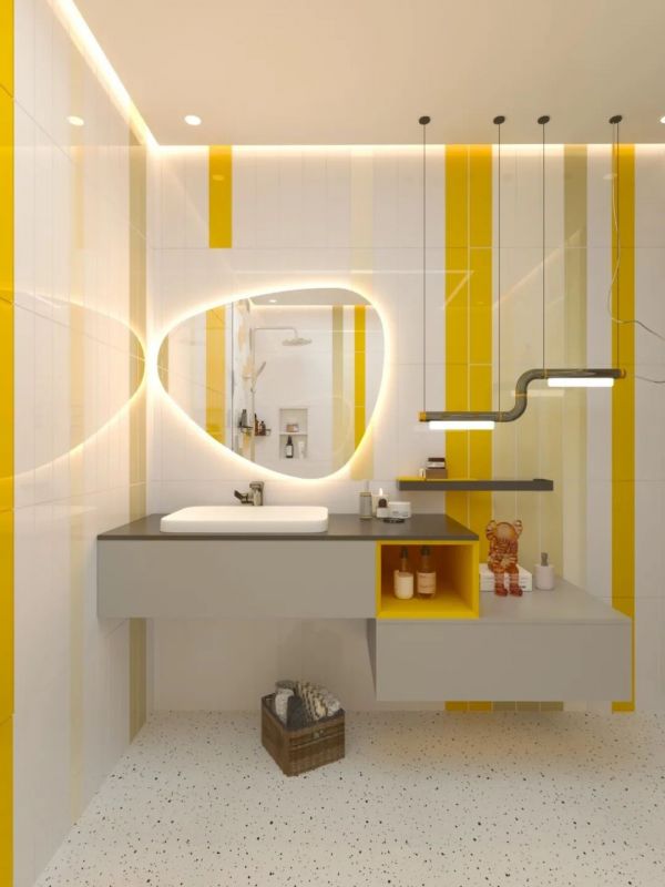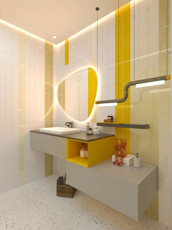 浅红灰和银杏黄碰撞的浴室柜,让整个空间灵动十足,岩板台面,更是精致。异形艺术智能镜,搭配金属置物架,高级感十足。