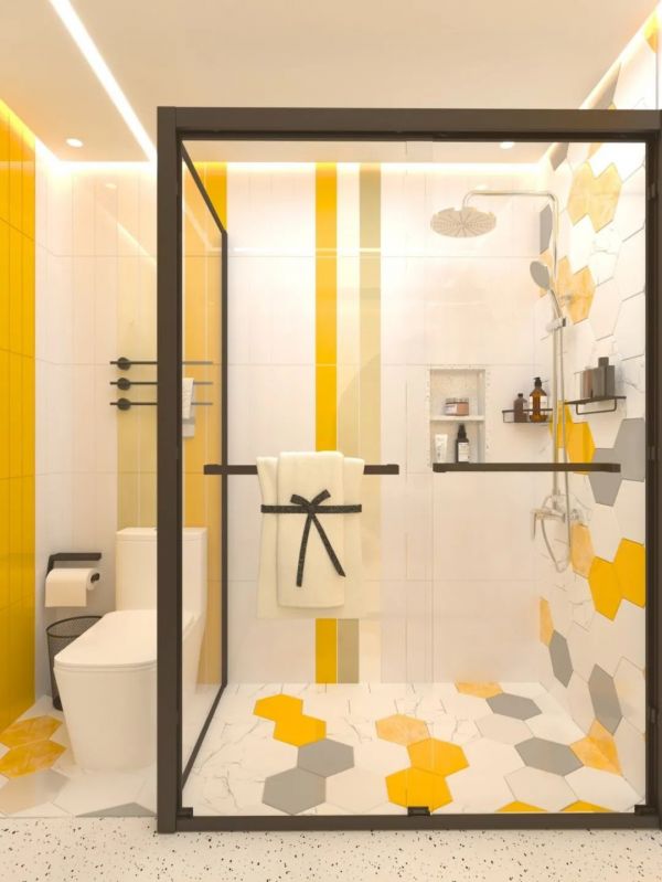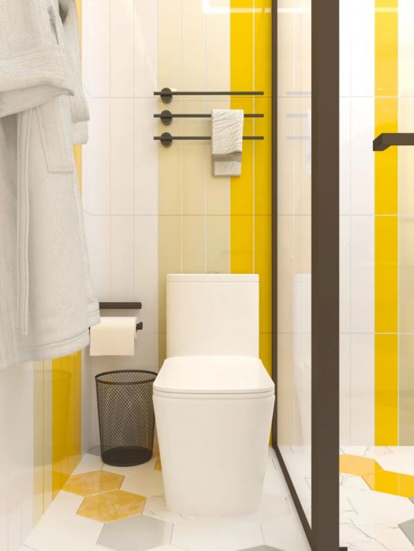 浴室整体采用纯美清新的暖白色,用靓丽的黄色作为点缀,让整个空间更加清绝明媚。