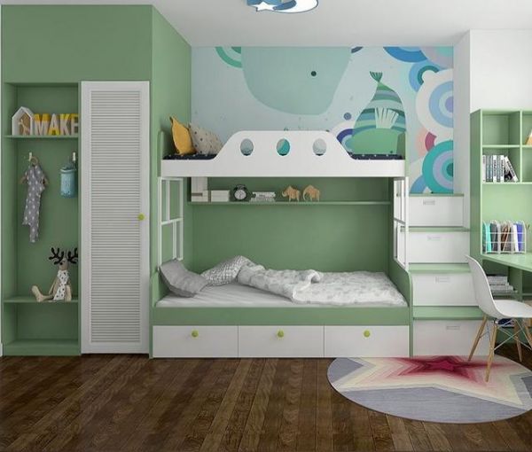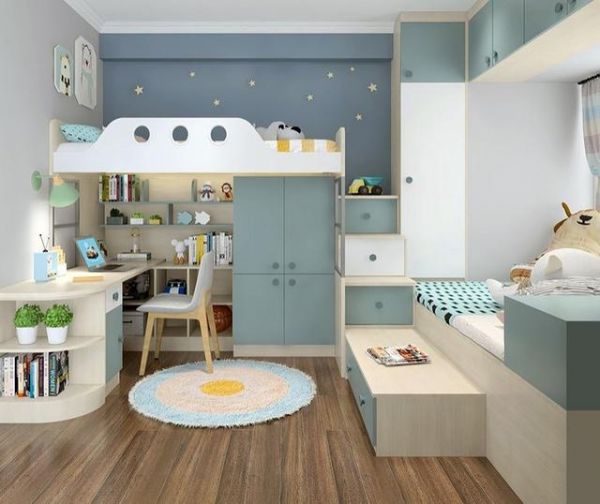 有没有瞬间多出一间房的感觉?这样设计可以说集学习、收纳、休息于一体,而且美观时尚,大方得体。颜色搭配合理,清新又秀气。尤其是现在的二胎家庭,两个孩子在一个房间还可以增加彼此之间的感情,体验一起成长的快乐。设计师肯定是下了一番功夫的, 提升家庭空间的可利用率,小空间大妙用。隐形收纳,各种杂物统统隐形,房间不会凌乱。