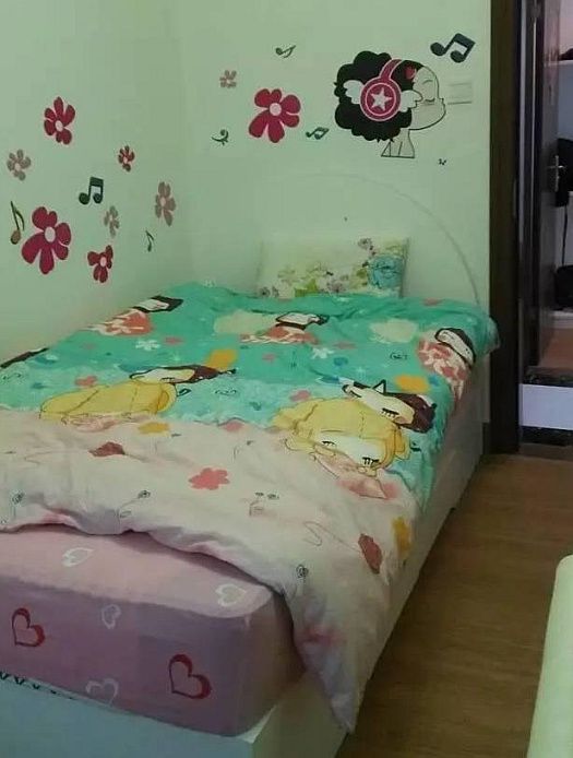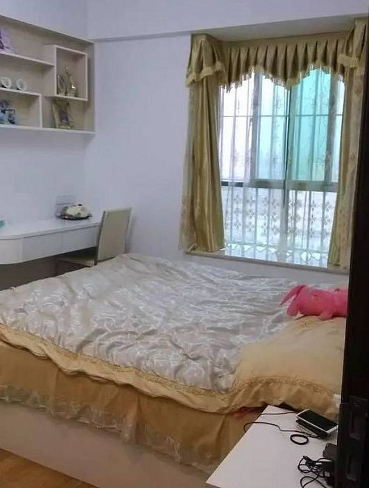 主卧,老婆说床只花了2000块,她当时一脸的占了便宜后的喜悦感!我觉得吧,便宜是便宜,但是真没法看啊,一个“土”字就形容得清清楚楚了!还有这窗帘,一看就是某宝爆款啊!