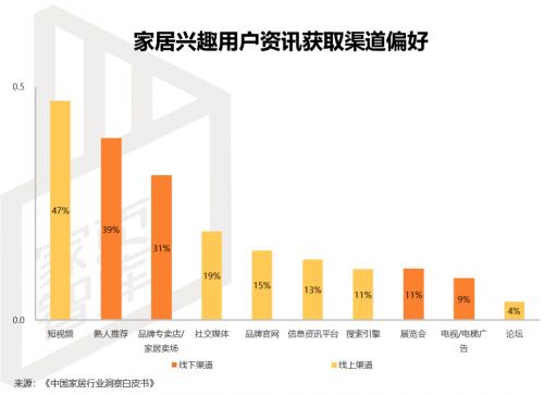电商渗透率逐年攀升、线上新渠道成就了一批新品牌,线上种草、在线下单、送货上门、晒单分享成为了固定消费动作。根据家居行业洞察白皮书的数据,已经有47%的消费者家居资讯主要来源是短视频,而电视/电梯广告仅为9%。
