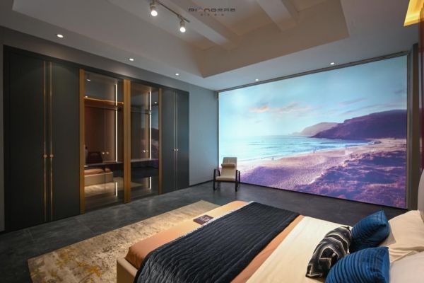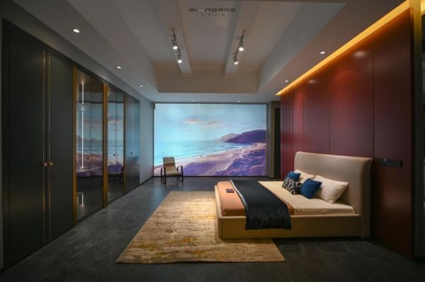 例如在皮阿诺现场部分展示的挚爱卧室空间、衣帽间中岛台模块,不少逛展客户就亲自体验操作了新颖的挚爱智能电动床,为观展人群带来了难得的感官舒适体验。而这只是阿诺【挚爱】卧室中的一部分,整个卧室配备智能联动灯光窗帘、智能影音抽屉、超短焦投影仪、联动幕布等,只要一声令下,影音、灯光、窗帘、床一键开启,全屋场景配合联动,科技感十足。