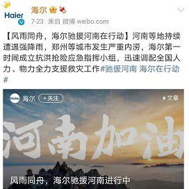 2、与鸿星尔克一样平时营销宣传较少,比较低调的还有家电行业的海尔智家、方太集团等。灾情发生后,海尔智家通过河南省慈善总会捐款2000万元,同时开放郑州市物流服务经营网点及仓库,13000多名服务兵也全力投入到救援抢险工作中;方太集团宣布捐款500万驰援河南,并将在门店清理完毕后,向普通市民开放。