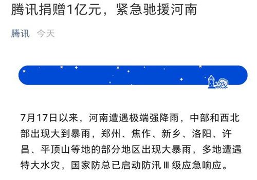 3、在互联网行业,腾讯、小米等企业第一时间捐款。腾讯公益慈善基金会宣布首批捐款1亿元,联合前线的救援机构与慈善组织,用于保障河南群众人身安全和紧急采购救灾物资;小米集团第一时间宣布捐款5000万用于支援灾区重建。