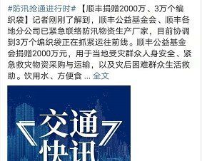 5、物流运输行业顺丰、菜鸟等企业。顺丰公益基金会捐赠2000万元,用于当地受灾群众人身安全、紧急救灾物资采购与运输,以及灾后困难群众生活救助;菜鸟网络宣布,将面向河南省内运输启动绿色物流通道,开展紧急救援运输。