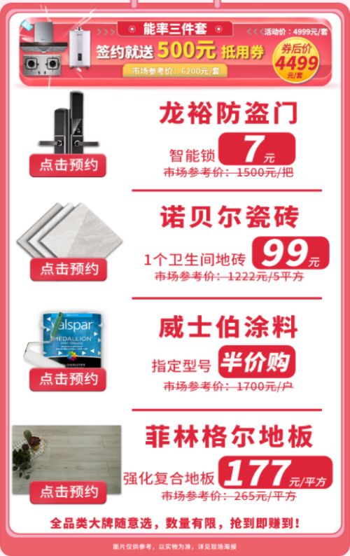 与此同时,百姓装潢携国内外大牌建材战略合作伙伴,为报名参加本次展会的客户精选大牌爆款材料,限量秒杀。签约就送能率三件套500元抵用券,原价6200元的三件套,券后仅4499元,龙裕防盗门智能锁7元秒杀,诺贝尔瓷砖装修一个5平米的卫生间仅需99元,更有大牌威士伯涂料半价购、菲林格尔地板177元每平米,此外还有百姓装潢众多战略合作伙伴,都将出席展会并推出全屋装修材料和家装用品超值放送活动,全品类大牌随意选,数量有限,抢到就是赚到。