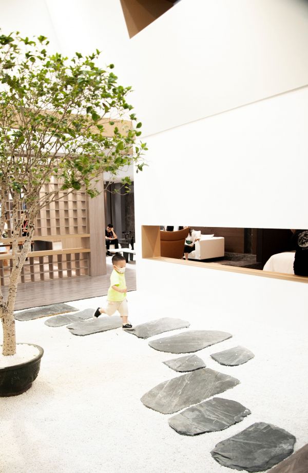进入展厅内部,自然诗意的气息便扑面而来。内部空间设计围绕两个中庭展开,没有过多的装饰,便呈现出灵动的自然家居艺术。同时在展厅内部不同特色的产品有序排布供观展者欣赏,丰富的花色、富有质感的材质,具有艺术感的搭配,良好的体验感得到了现场众多参展者的认可与称赞。