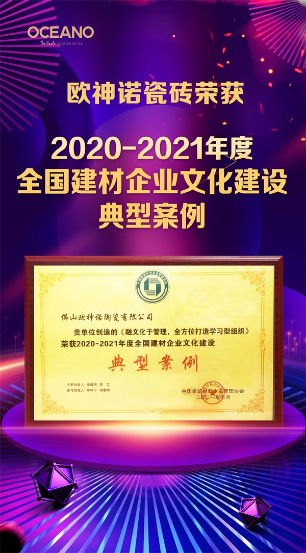 7月16日,欧神诺瓷砖迎来企业文化重磅大奖,以《融文化于管理,全方位打造学习型组织》文化建设项目获得了“2020-2021年度全国建材企业文化建设典型案例”奖。