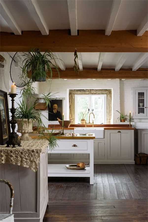 带木梁的小屋厨房、白色振动柜和屠夫台面、一些艺术品和许多盆栽植物。