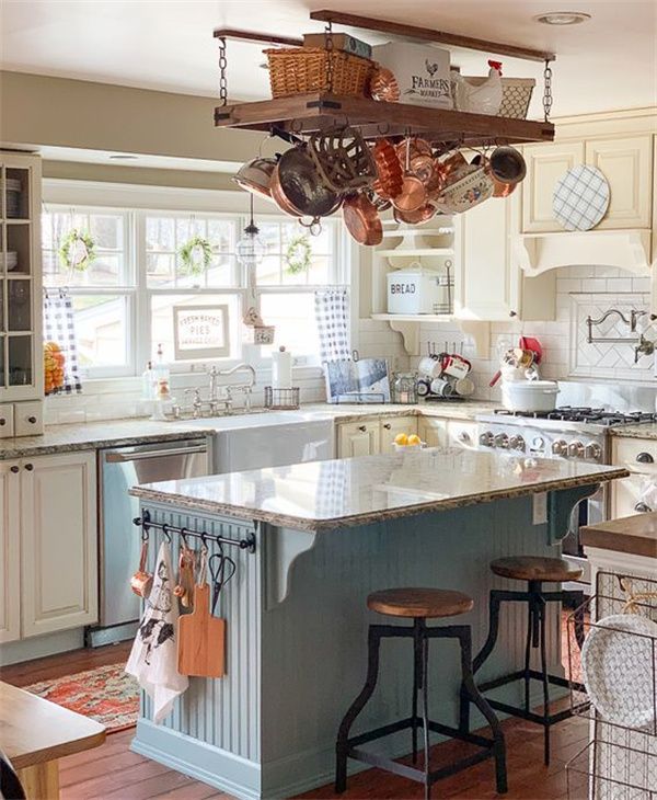 一个带浅黄色橱柜的创意小屋厨房,一个蓝色厨房岛和中性台面,一个带铜锅和锅的衣架。
