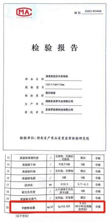 这就不得不提圣保罗浸渍纸层压木质地板,今年7月初,其获得了《湖南省产尚品质量监督检验研究院》的全项合格检验报告,其中该地板的甲醛释放量更是达到了ENF≤0.021mg/m³的超高标准。ENF级的甲醛释放限量值是0.025mg/m³,对标国际一线标准,而圣保罗地板远远地将这一标准甩在了身后。