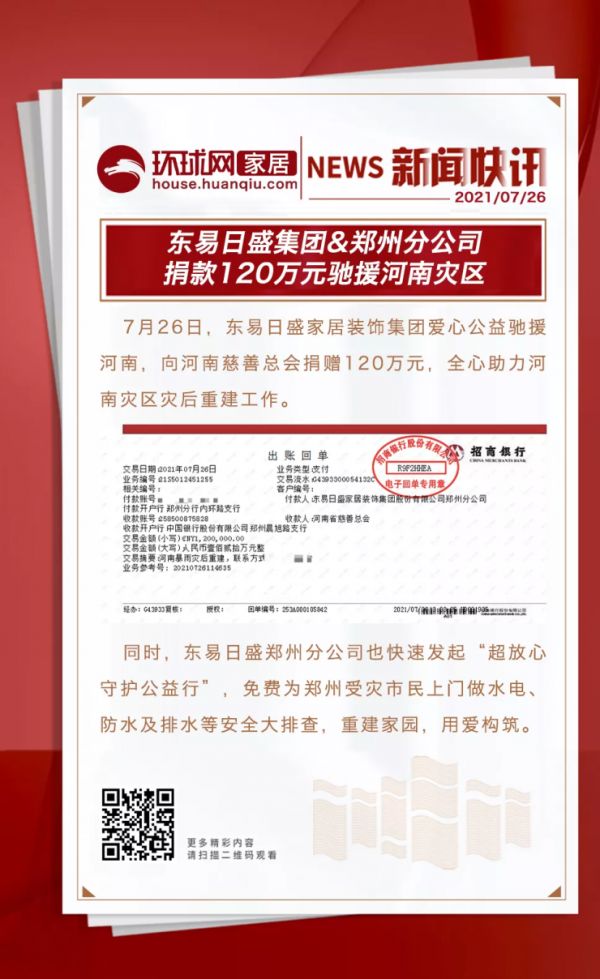7月26日,东易日盛家居装饰集团与郑州分公司爱心公益驰援河南,向河南慈善总会捐赠120万元。目前,捐款已抵达灾区,全心助力河南灾区救援行动和灾后重建工作。