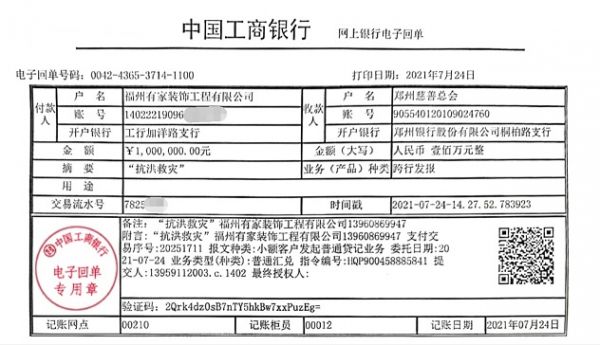 7月24日,有家装饰向郑州慈善总会捐款100万元,用于紧急采购救灾物资,以及灾后重建。
