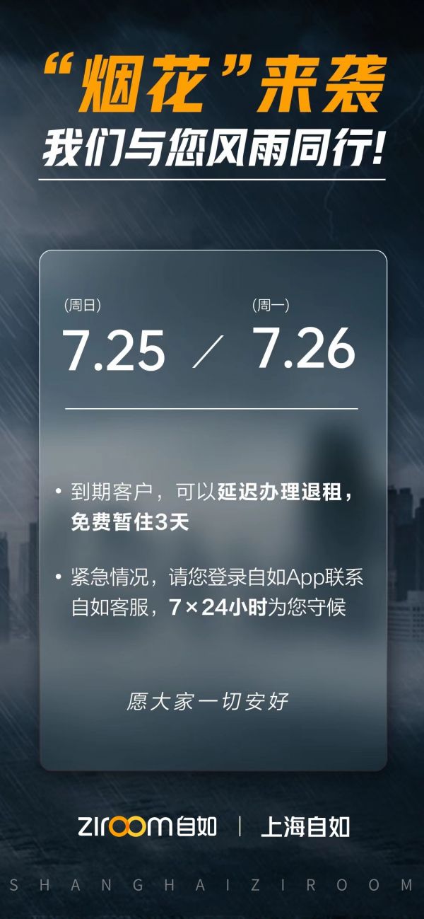 有租户表示,近日面临房屋租住到期的情况,但极端天气下找房、搬家存在极大的安全隐患。目前,上海自如提出:在“烟花”台风来袭、租客房屋租住到期之时提供延迟退租服务。7月25日至7月26日到期的租客,均可免费暂住3天,待台风极端天气缓和、无较大影响时再办理相关退租手续。