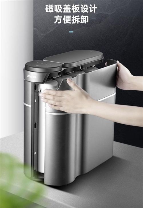 立升家用超滤净水器C5在外形设计上也很人性化,首先是体积小,相当于两个暖水瓶并排大小的体积,很容易在水槽下的空间找到安身之所;其次是安装方便,只有一个自来水入口和直通水、超滤水和口感水三个出口,且都在机身下部,便于走线和整理;然后机身盖板使用了磁吸设计,可以免工具徒手拆卸,方便自己更换滤芯。