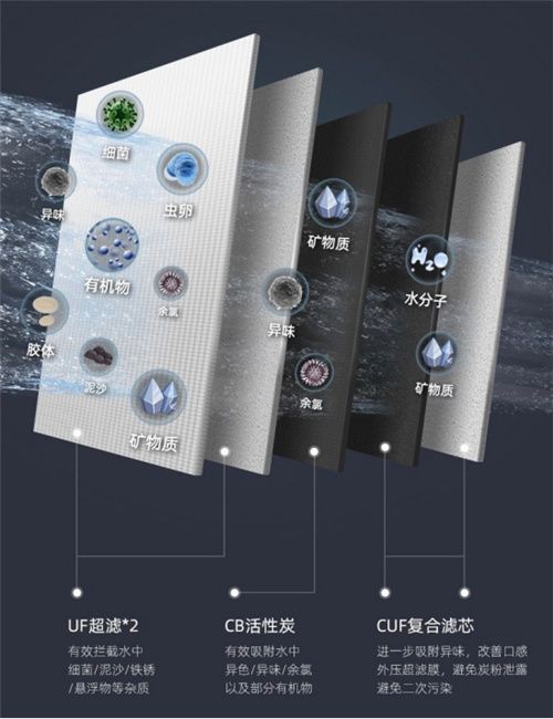 经过前面两级滤芯过滤后的超滤水,会继续经过两个双炭滤芯进一步改善口感和水质。具体来讲,第三级滤芯是CB活性炭滤芯,能做到有效吸附异色异味、余氯以及部分有机物,让水更加清甜可口;最后一级则是CUF复合滤芯,可以避免炭粉泄露造成的内部二次污染,最终经过四级滤芯而出的,是可以直接饮用的口感水。