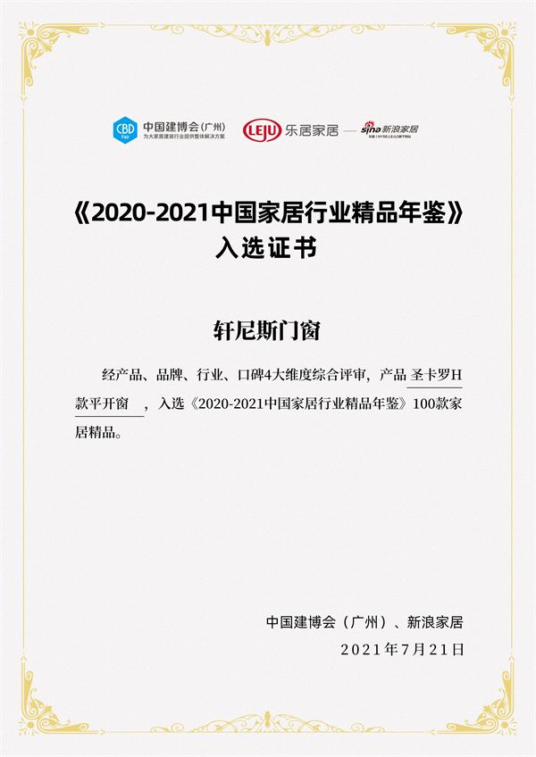 在展会期间举行的“了不起的家居质造·《2020-2021中国家居行业精品年鉴》”发布会中,轩尼斯门窗凭借“圣卡罗H款平开窗”产品,以哥特圆弧压线设计,双断桥多腔体隔热结构,搭配智能APP系统控制,凭借将怀古的浪漫情怀与现代人对生活需求的巧妙结合,实力入选《2020-2021中国家居行业精品年鉴》100款家居精品,并荣获授牌证书!