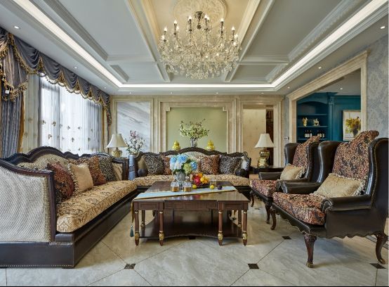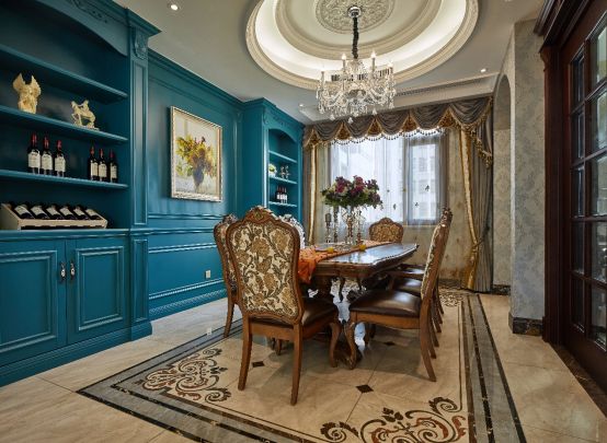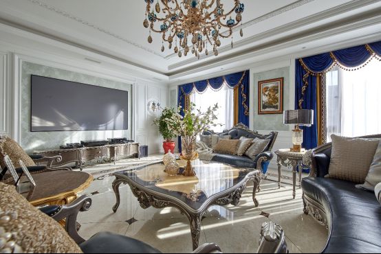 这里边的特色是什么?你一入户,通过自己家宅院的大门,进去以后,是一个非常庞大的一个入户门,推开门以后,通过法式的一个方式来体现,一个圆形的拱门进去,有一个若隐若现的屏风,然后就是整个的落地窗,看到大海,都是那种感觉,任何人进来先从震撼,再到眼前一亮,这里边用到了很多我喜欢的法式元素。
