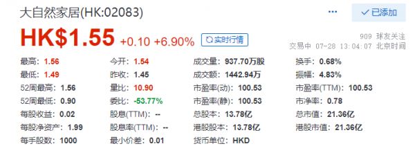 2021年7月28日,大自然家居复牌,截至13时04分,股价高涨近7%,总市值21.36亿元。