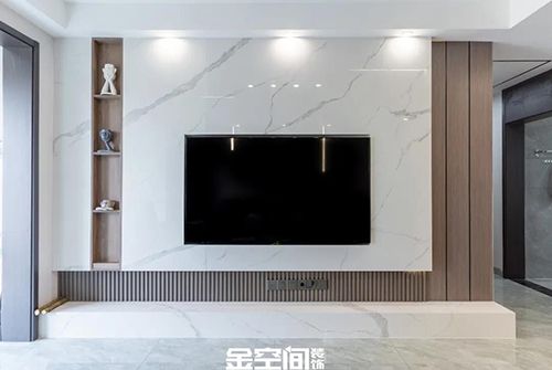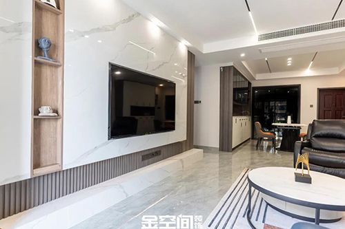 用饰面板打底,再将大理石瓷砖覆盖而上,做双层电视背景墙来增加层次感,独一无二的大理石的纹理,简约流畅的花纹带来强烈的视觉冲击。