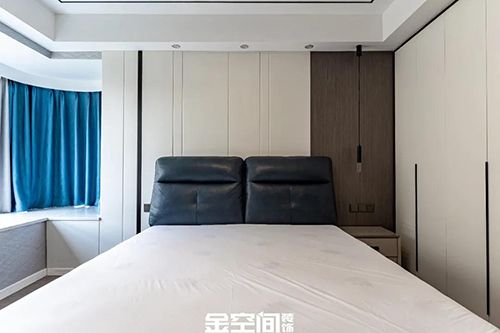 背景墙做了一个简单的拼色,床头的小吊灯让空间更具层次感,飘窗带来的自然的光线总是会给人以无需多言的柔软与舒适,制造大面积留白同样道理,静谧之意油然而生。