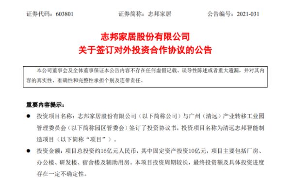16亿元!志邦家居拟投建志邦清远智能制造项目