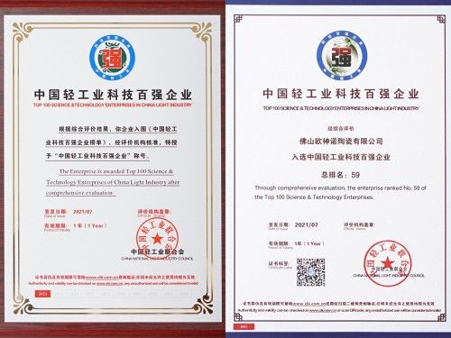 欧神诺瓷砖荣获“中国轻工业科技百强企业”称号