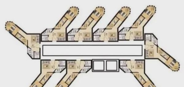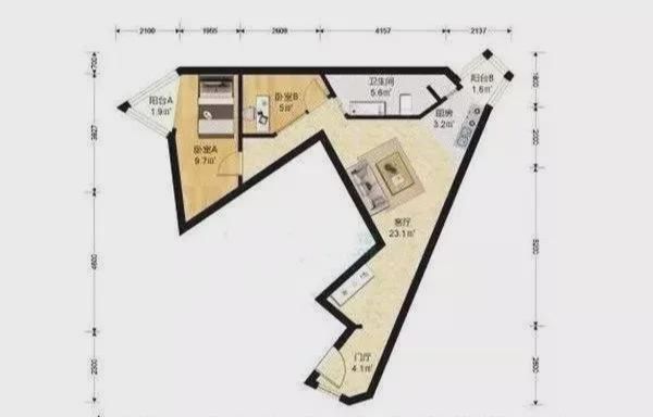 这种房子可以说空间利用率非常差,不管是设计,改造,还是家具布局,都非常让人伤脑筋,很多室内死角利用不到,即使利用得当,家具也不好搭配摆放,且拐角太多,大大增加了室内的活动动线。