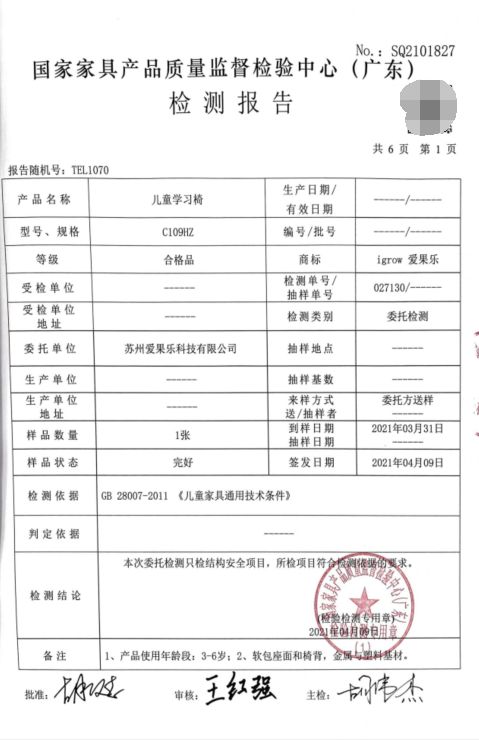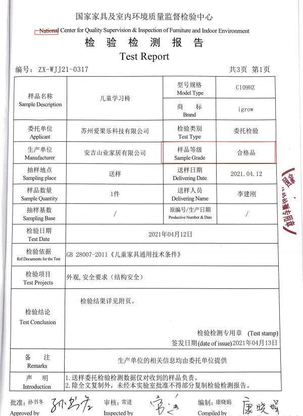 一向重视产品品质的爱果乐,在收到检测有问题的结果通知后,立即对未符合检测标准的C109HZ型号学习椅进行了整改,将孔及间隙调整至6mm以下。3月31日,爱果乐提出复检申请,最终检测结果符合国家家具产品质量监督检验中心(广东)的检测标准。