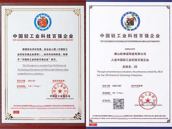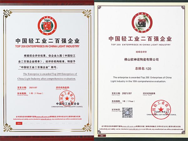 双料殊荣|欧神诺瓷砖荣登年度“中国轻工业二百强企业”、“中国轻工业科技百强企业”榜