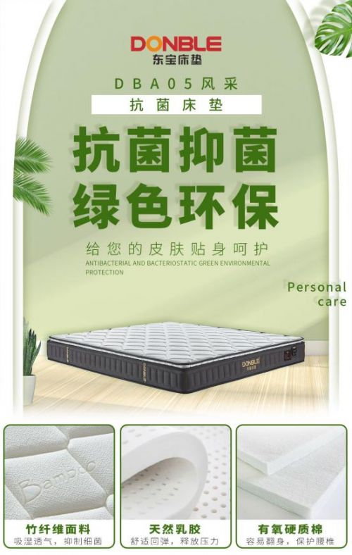 人体掉落的汗液、皮肤屑会慢慢堆积在床垫里,致使床垫内的细菌和螨虫快速生长繁殖,因此可以选择可阻拦汗液和皮屑的床垫。东宝床垫“风采”表面选用竹纤维面料,吸湿透气,对抑制细菌螨虫繁殖具有促进作用,能够给予我们的肌肤贴身呵护。