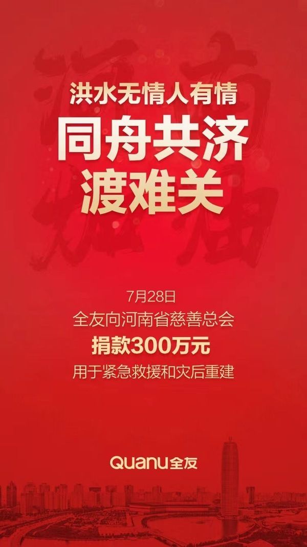 快讯:全友家居向河南省慈善总会捐款300万元用于紧急救援和灾后重建