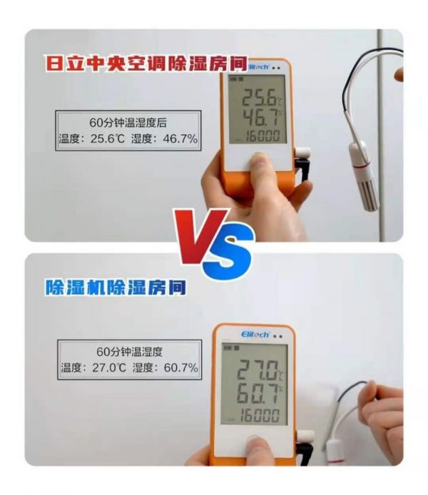 这样的除湿效果是不是没话说,不仅如此,在江南地区一户地下室的测试中,日立中央空调的除湿表现依旧非常优秀。初始测得地下二层的温湿度分别为27.6℃、79.4%后,打开日立中央空调“舒爽”模式,30分钟后进行测试,结果为25.2℃、50.6%,温湿度已基本达到设定的温湿度,之后运行的一小时,室内温湿度也一直保持在设定值范围之内。