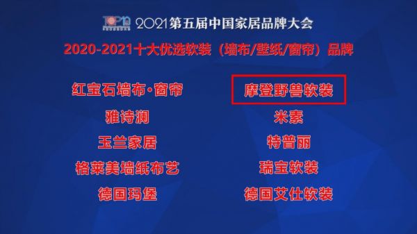 2021年7月19日,高端墙布品牌“摩登野兽”荣登“2020-2021十大优选软装品牌”榜,这一榜单是由西街传媒、北京商报家居频道主办,中国经济传媒协会、全国工商联家具装饰业商会指导;以2020年7月1日-2021年6月30日为一个考察年度,根据五大标准甄选出各细分领域最优秀、最创新的十个代表性品牌的榜单,极具权威性。