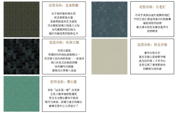 本次系列收录了克莱斯勒、帝国大厦、费尔蒙、百老汇、洛克菲勒等五种花型设计,从经典建筑中汲取设计灵感,并重新传达到墙面装饰中。