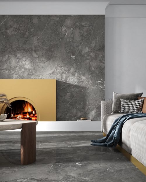 此外,吴总还介绍道,“随机无限连纹”技术的加持,使得自然连纹密缝岩板不用墨守成规,只需在铺贴时保持底纹箭头方向一致,随意拼接,即可实现空间无限连续纹理,让空间不设限。