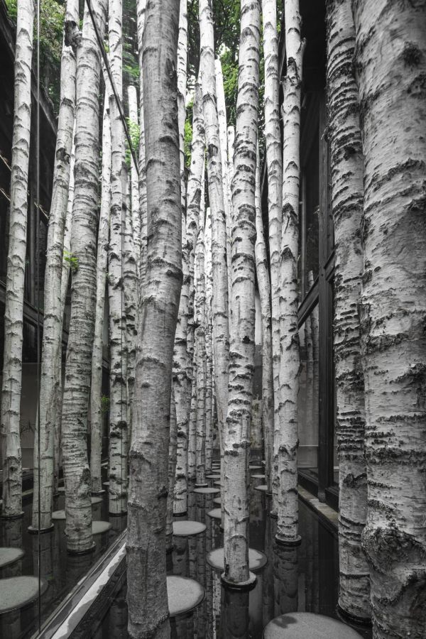 院里侧着的水上白桦林,结合镜面的反射,透过窗户别有一种美感。踩着其间大大小小的圆形石板,像是穿行于森林间,又美又诗意。整片白桦林搬进镜面设计的天井处,踏着圆形石板,仿佛置身于园林山水之间。