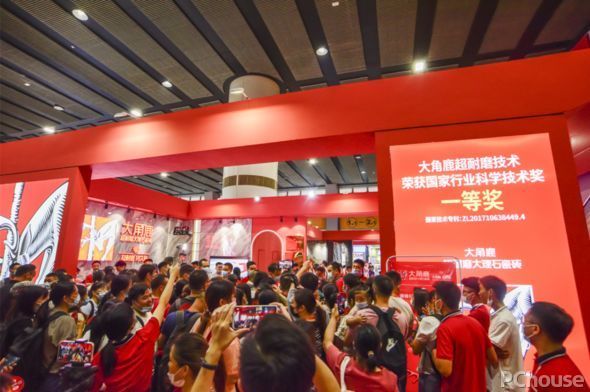 在本届广州陶瓷工业展上,大角鹿依旧延续一贯经典的中国红,在展会上放眼望去格外醒目亮眼。展厅遵循中国古建筑营造法则,融合了简约而出挑的造型,呈现堂皇端庄、宏伟壮观的视觉效果。展厅的墙上、地面上均铺贴了大角鹿主推的“王炸”产品——超耐磨密缝连纹大理石瓷砖,通过不同规格连纹产品在不同场景的应用效果,赋予每个空间不一样的美,引得现场参观者纷纷赞赏,更赢得众多客商驻足品鉴。